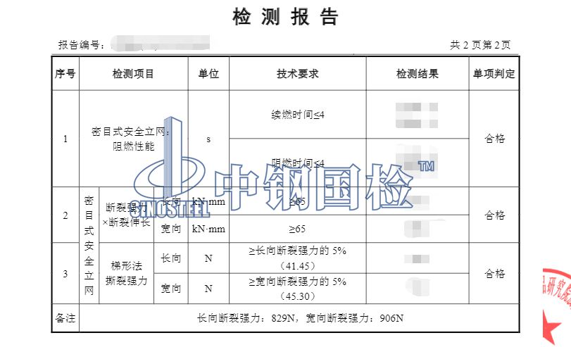 中鋼國檢擁有符合標準要求的專業(yè)實驗室,可以保證檢測數(shù)據(jù)的準確性。中鋼國檢的服務群體已經(jīng)覆蓋全國,目前有十多家分公司和34個辦事處在全國各地分布,能做的及時響應,及時出具報告,并具有CMA/CNAS檢測資質(zhì),檢測報告全國認可。下面是某單位委托中鋼國檢做的安全網(wǎng)檢測,詳細內(nèi)容如下: