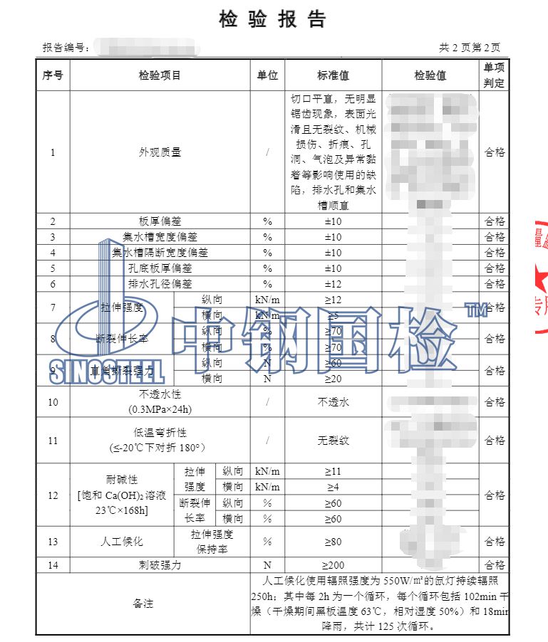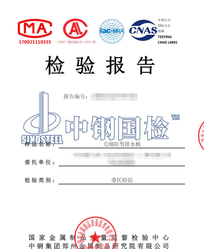 檢驗項目:1.外觀質量,2.板厚偏差,3.集水槽寬度偏差,4.集水槽隔斷寬度偏差,5.孔底板厚偏差,6.排水孔徑偏差,7.拉伸強度,8.斷裂伸長率,9.直角撕裂強力,10.不透水性,11.低溫彎折性,12.耐堿性,13.人工候化,14.刺破強力。