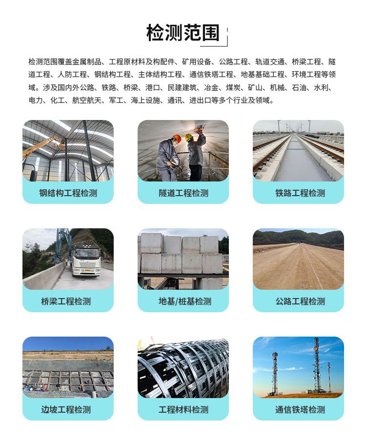 具有CMA/CNAS/CAL/鋼結(jié)構(gòu)/橋隧/公路/鐵路等檢測資質(zhì),檢測報告全國認(rèn)可。